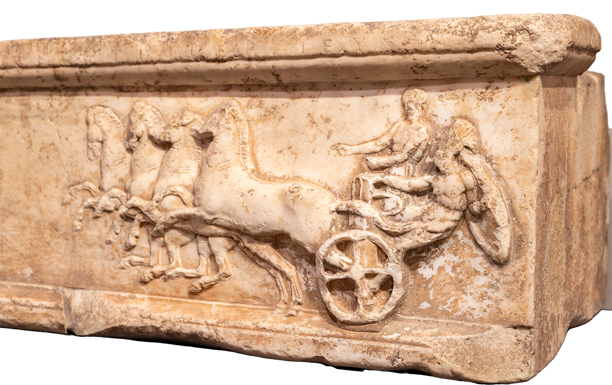 Particular to Athens was the apobatesor ‘dismounting’ contest in which armed warriors riding on chariots driven by charioteers leapt on and off their vehicles as they raced through the market place or Agora. This contest was singled out by Demosthenes (Erotikos 61.23) as “the noblest and grandest of competitive exercises... one which approximates to the realities of warfare”. This relief resembles the race as depicted on the north and south friezes of the Parthenon. The base carried a monument to honor the victory of a man in the apobates race. The inscription at the top names the winning dismounter: KRATES, son of Heortios of Piraeus.